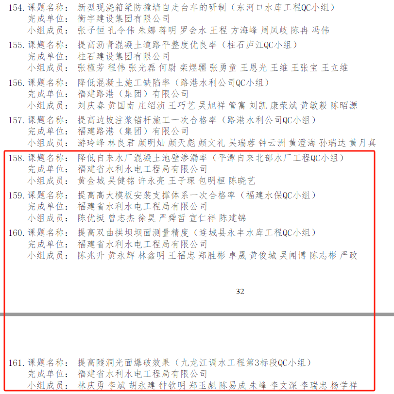 日前,工程局公司選送的8項QC小組成果全部通過中國水利工程協會評審,獲評2024年度水利工程優秀質量管理小組成果。其中,《提高土料碾壓筑堤一次驗收合格率》獲得Ⅰ類成果,《降低自來水廠混凝土池壁滲漏率》《提高高大模板安裝支撐體系一次合格率》《提高雙曲拱壩壩面測量精度》《提高隧洞光面爆破效果》獲得Ⅱ類成果,《提高埋石混凝土擋墻PVC排水管一次驗收合格率》《提高雙曲拱壩自密實砼澆筑質量合格率》《提高隧洞二襯混凝土外觀質量驗收合格率》獲得Ⅲ類成果,集中展示了工程局公司在建工程質量改進與創新發展水平。